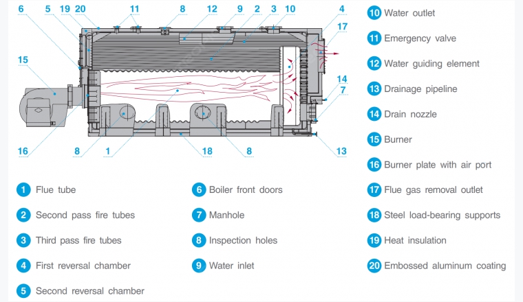 • Combustion chamber, fire tube, and boiler shell have a cylindrical shape. Convective heating surfaces are formed by second and third pass smoke tubes, located axisymmetrically around the combustion chamber. The two-three-row arrangement of the second pass smoke tubes provides a high heat transfer rate, increasing the boiler efficiency.